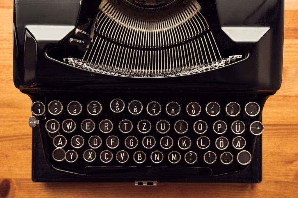 Vintage typewriter machine on writers desk, top view flat lay conceptual image for blogging, publishing, journalism or poetry writing.
